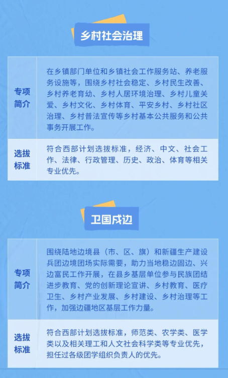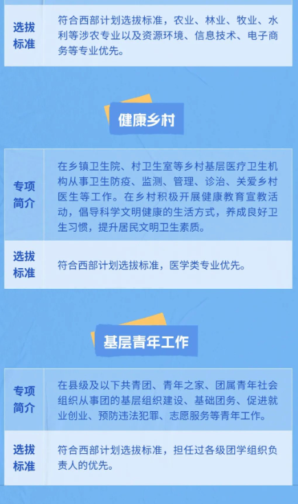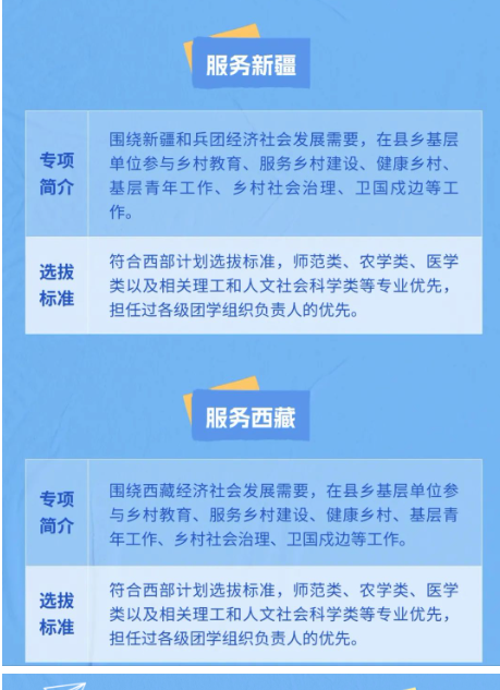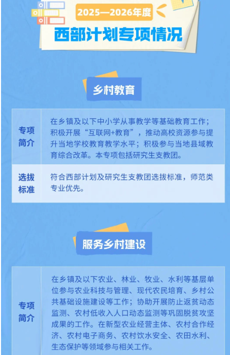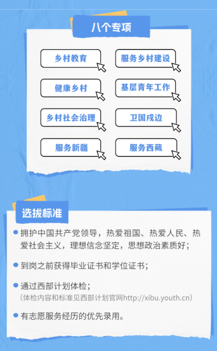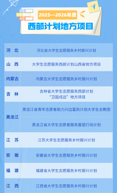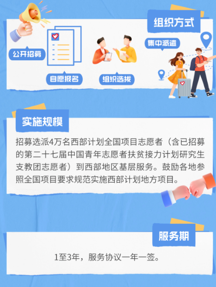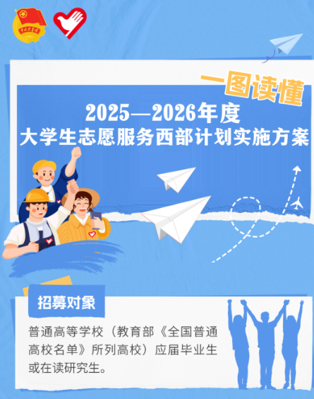 2025年大学生志愿服务西部计划正在火热招募中欢迎广大有理想、敢担当能吃苦、肯奋斗的新时代好青年踊跃报名一起扎根基层,建功西部,报效祖国。3月1日至5月10日,2025年普通高等学校应届毕业生或在读研究生,可通过微信公众号“西部志愿汇”(菜单栏中的“我要报名”)或登录西部计划官方网站(http://xibu.youth.cn),在西部计划报名系统中注册报名。什么是西部计划?参加西部计划主要做些什么?2025-2026年度大学生志愿服务西部计划实施方案一图读懂。