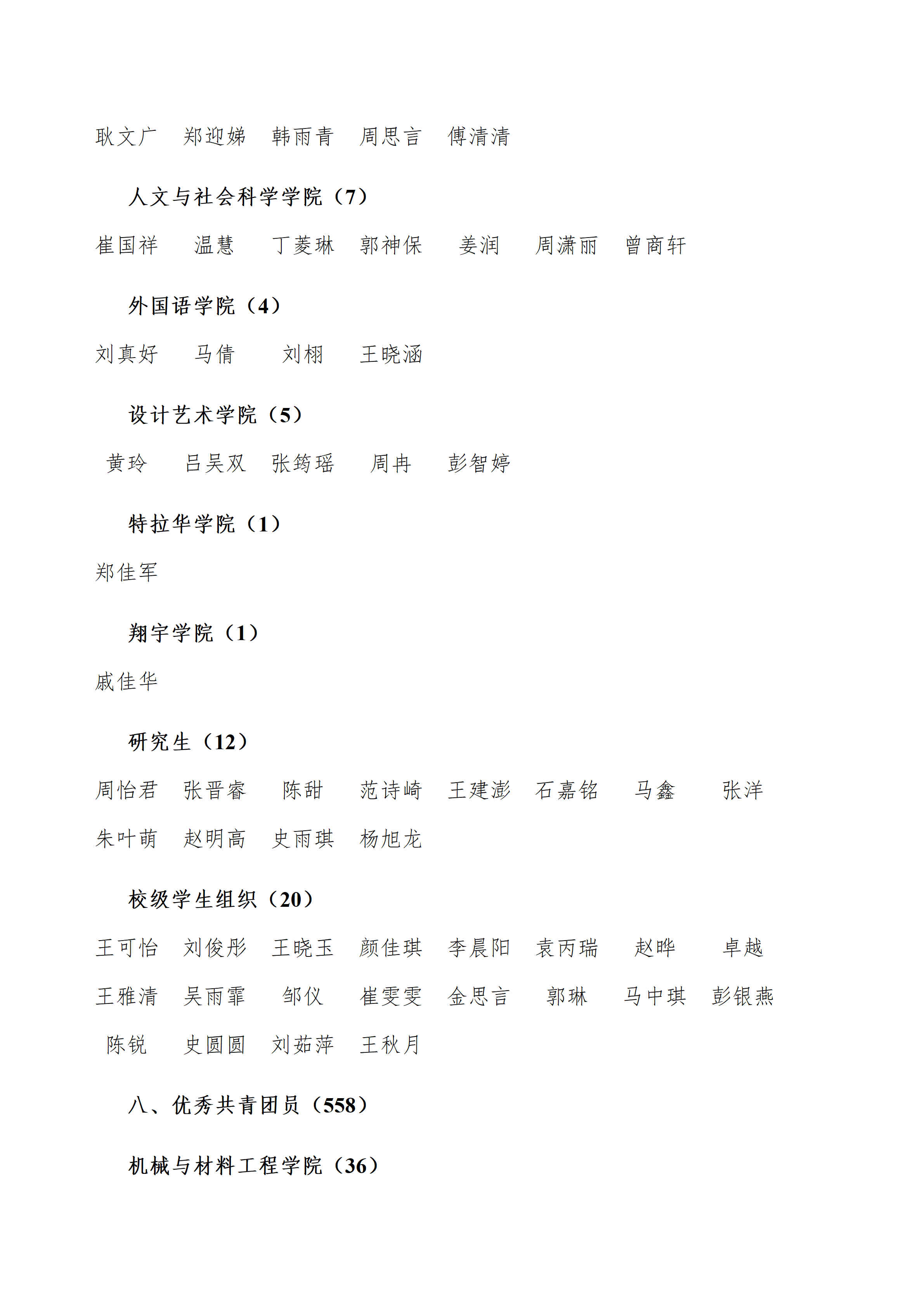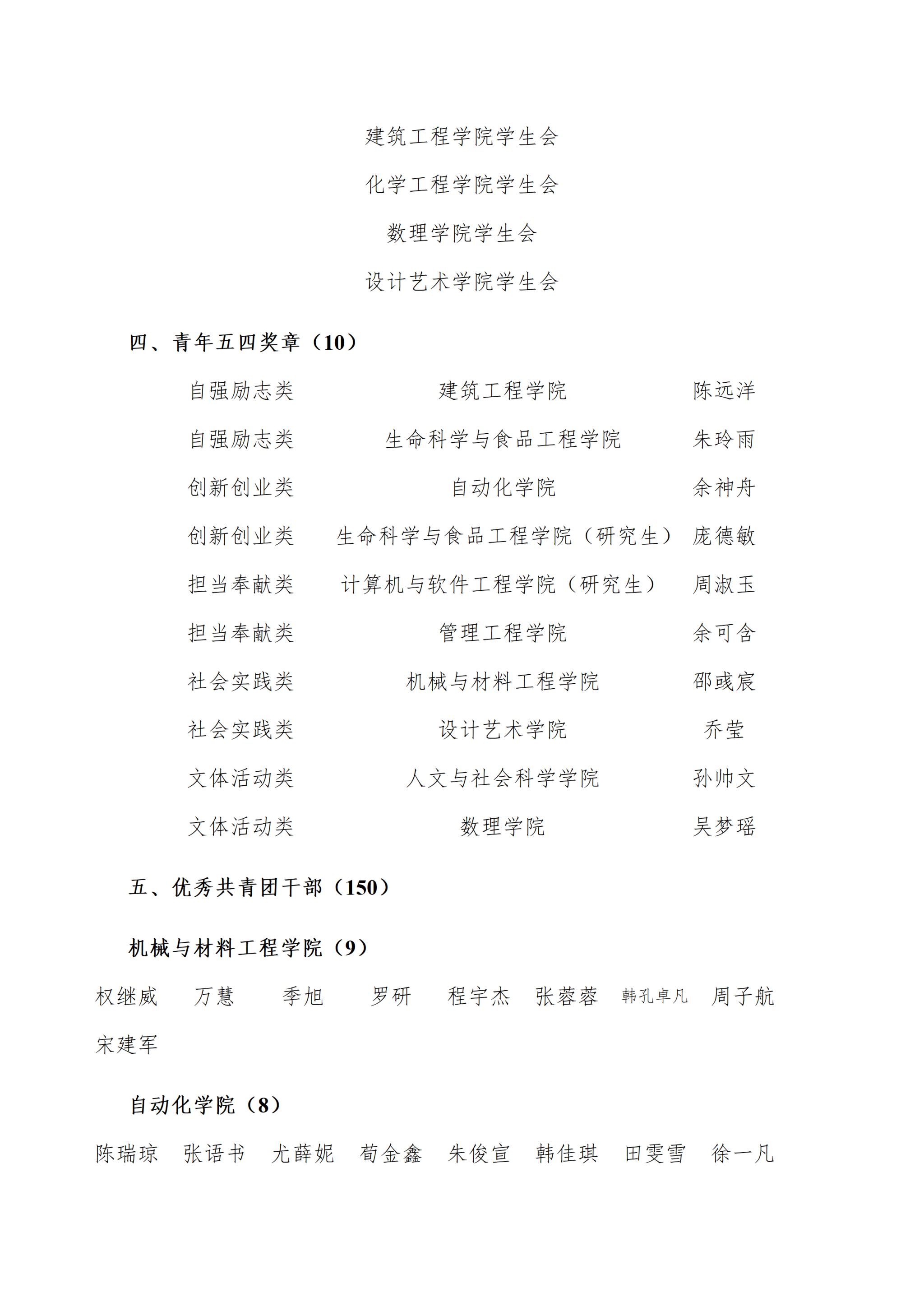 根据《关于申报2025年度淮安大学“五四”表彰评选工作的通知》明确的范围条件、基本程序,经集体(个人)自主申报,学校组织评审,拟授予计算机与软件工程学院团委等5个团委“五四红旗团委”称号,拟授予机械与材料工程学院2023级金材1231班团支部等10个团支部“五四红旗团支部”称号,拟授予电子信息工程学院学生会等5个学生会“优秀学生会”称号,拟授予陈远洋等10名同学“青年五四奖章”称号,拟授予权继威等150名同学“优秀共青团干部”称号,拟授予孙浚博等560名同学“优秀共青团员”称号。