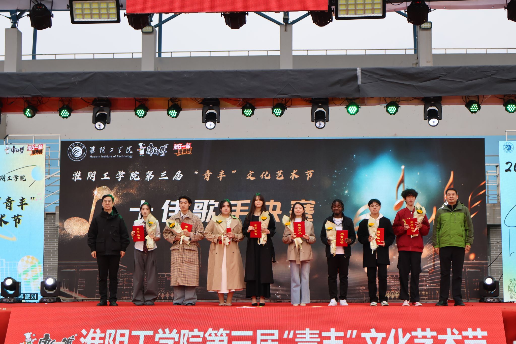 翟尧、于文天为GCE23郭安达、车辆1241严文杰、金融数学1245肖雨欣、交通1252刘学铭、生物1232时婧、生物1232盛怡蕊、通信1231张昕韵、建筑1221赵恩民8位同学颁发“十佳歌手”优秀奖。