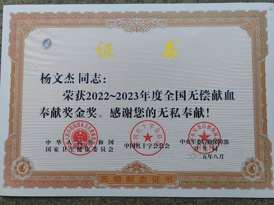 自2003年首次参与无偿献血以来,杨文杰老师坚守公益初心20余载,献血足迹遍布山东东营、青岛,新疆阿勒泰,常州及淮安等多座城市,累计献血51次,合献血量达20000毫升,相当于4-5名成年人的全身总血量(成年人全身血量约4000-5000毫升)。2013年,他主动报名成为江苏省造血干细胞志愿捐献者,将个人HLA分型资料汇入中国造血干细胞捐献者资料库,为血液病患者点亮生命希望。2022年起,他主动转为单采血小板捐献,近三年完成39次捐献。