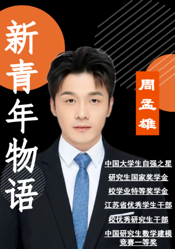 周孟雄,中共党员,自动化学院2021级硕士研究生,曾任研化21级5班班长、校研究生会主席团成员;获得"中国大学生自强之星”、“江苏省优秀学生干部”、研究生国家奖学金、校长奖章、五四青年奖章、“校优秀共青团员”、“校优秀共青团干部”、“校优秀研究生干部”、“校优秀研究生”等荣誉;曾获江苏省研究生数学建模科研创新实践大赛三等奖、“中国光谷·华为杯”第十九届中国研究生数学建模竞赛一等奖等;发表SCI论文3篇,授权国家发明专利17项。现就职于衢州动力电池和储能研究院,任研究院党支部副书记、产业科技处主要负责人职务。