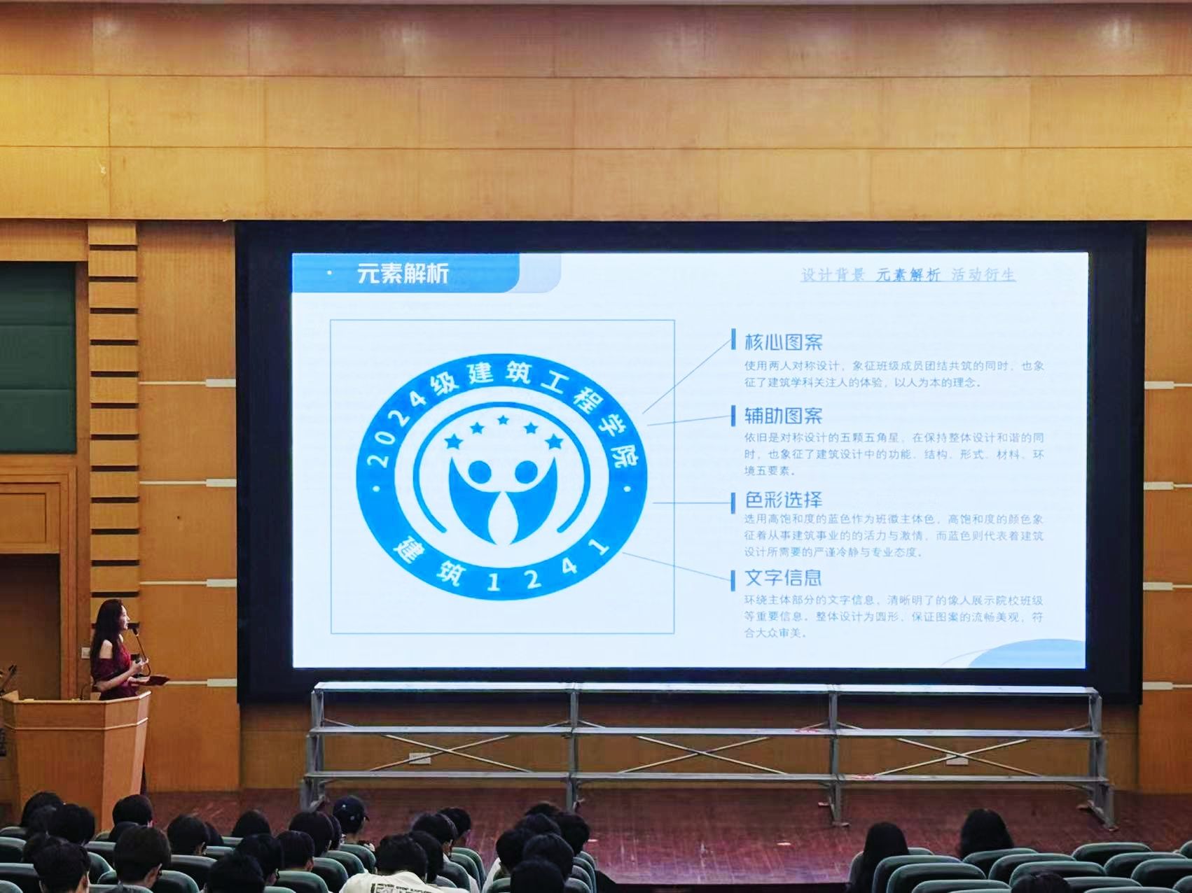 比赛现场,各班精心设计的班徽惊艳亮相。每一枚班徽都蕴含着独特的寓意,巧妙融合周恩来精神与班级特色。有的班徽以灯塔与横梁为主元素,突出“站着是根柱,躺下是根梁”的建工精神;有的班级用高耸的塔架结构大桥来展示知识与实践的结合,明确的目标以及坚定的意志;有的班级把建筑与五颗星结合,寓意同学们时刻保持爱国精神,立志成为国之栋梁。班级代表通过PPT展示、现场讲解,生动诠释班徽设计理念,赢得阵阵掌声。